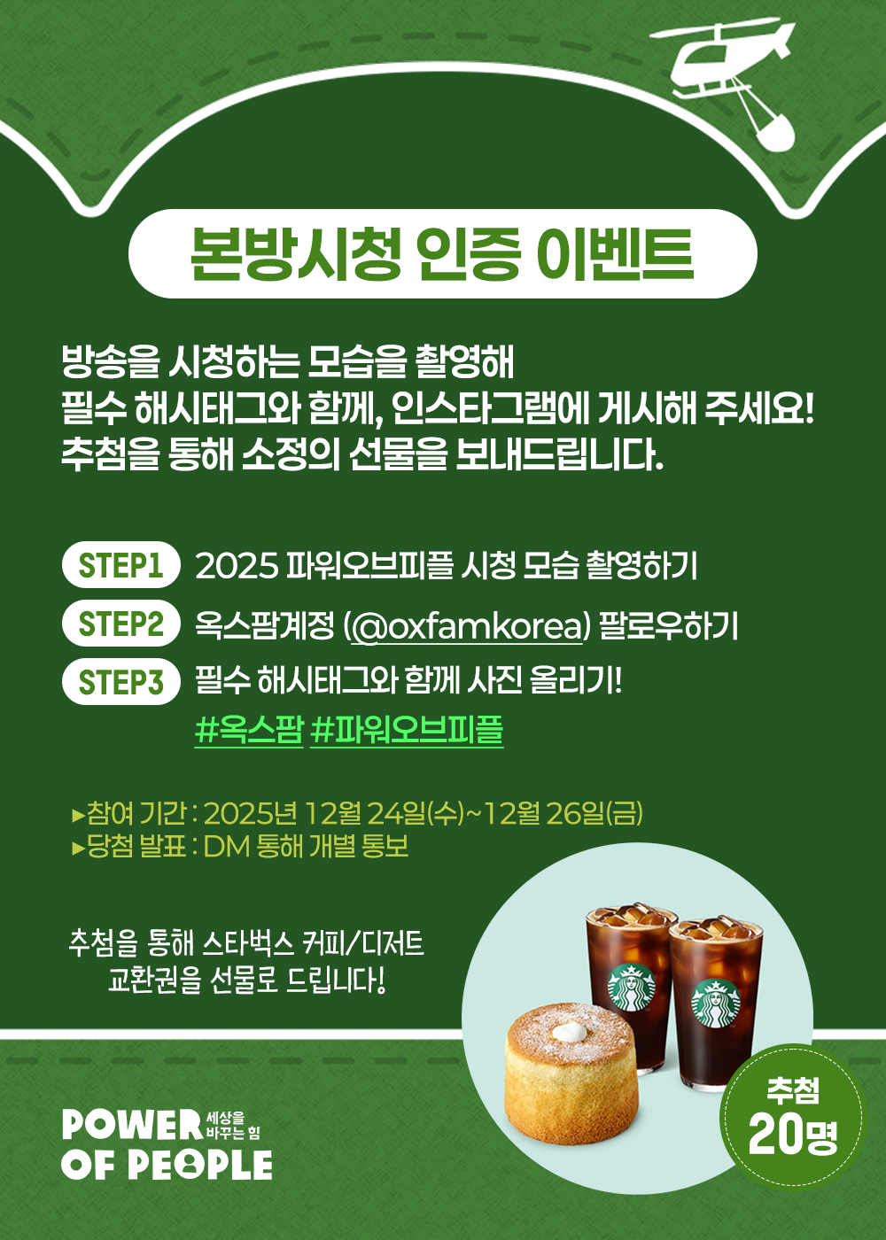 Step 1. 2025 파워오브피플 시청 모습 촬영하기 Step 2. 옥스팜 계정(@OxfamKorea) 팔로우하기 Step 3. 필수 해시태그와 함께 사진 올리기 #옥스팜 #파워오브피플