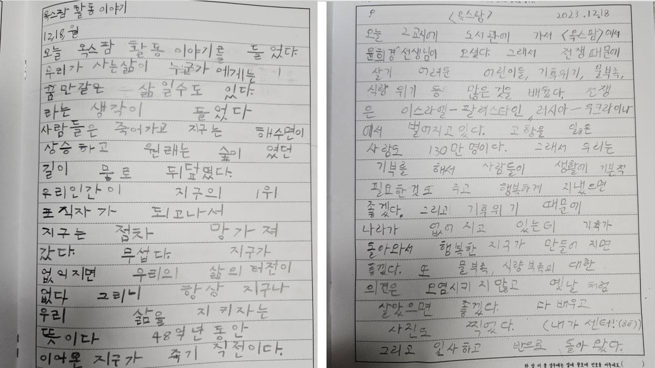 세계시민교육을 마치고 학생들은 소감문을 작성하는 시간을 가졌습니다. 또박또박 자신의 생각을 적어 내려가는 모습에서 더 나은 세상을 만들기 위한 학생들의 진지한 마음과 비장한 각오가 느껴졌습니다. 옥스팜도 이 소중한 마음들을 담아 재난과 전쟁으로 위험에 처한 사람들을 돕고 가난이 없는 공정한 세상을 만들기 위해 더욱 노력하겠다고 다짐했습니다.