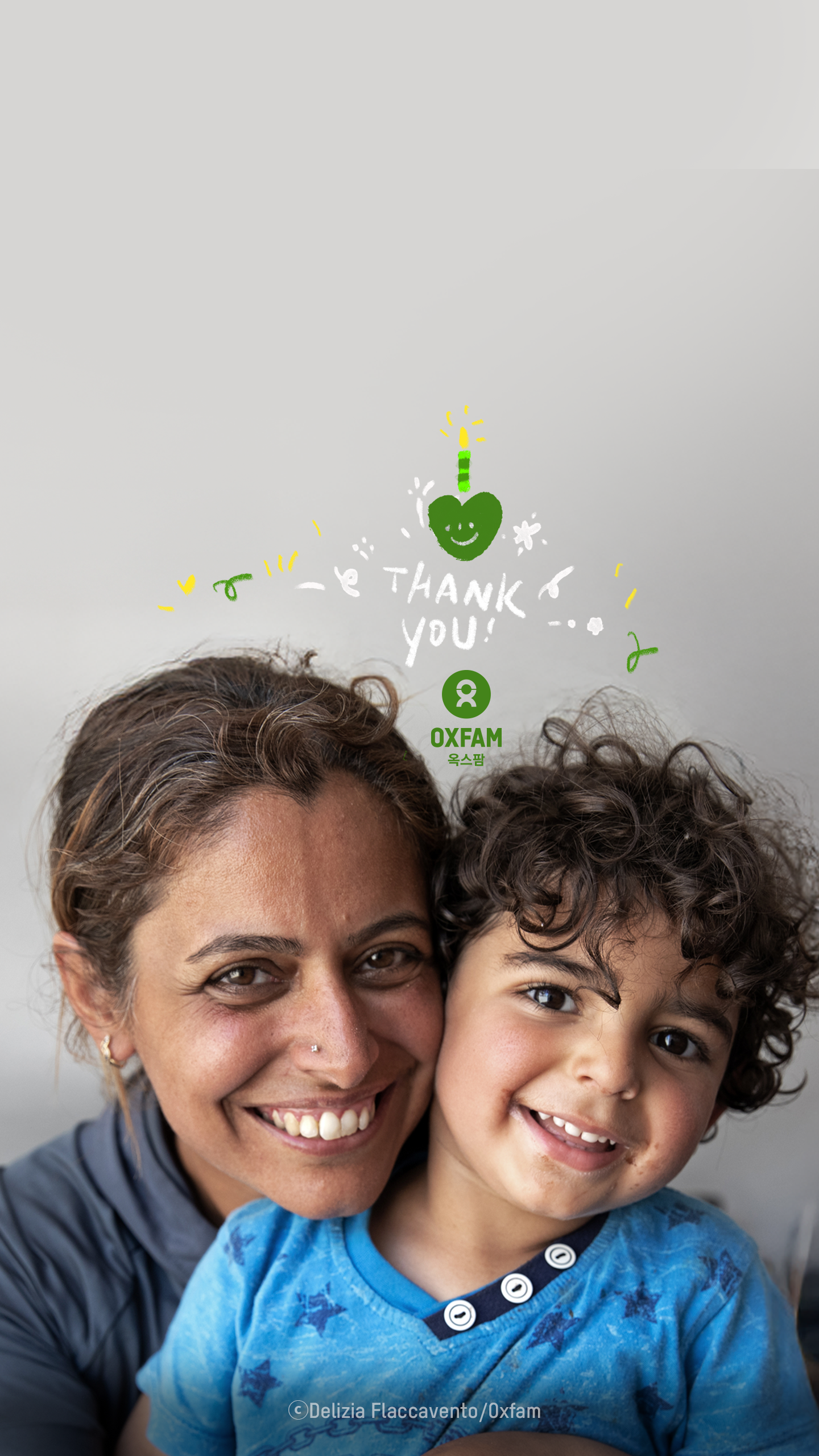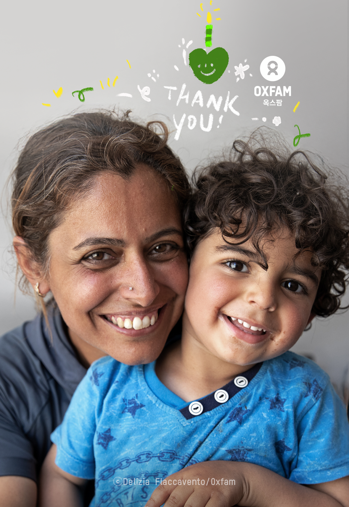 지진으로 집과 일상을 빼앗긴 엄마와 아들이 옥스팜 긴급구호 물품을 받고 기뻐하는 모습