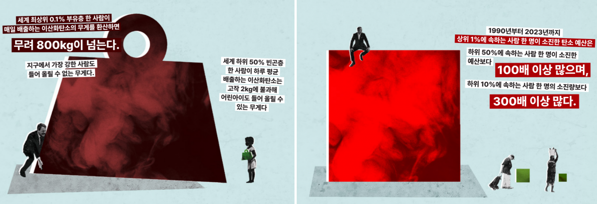 기후위기는 곧 인권의 문제입니다. 물, 식량, 생존, 주거와 같은 인간의 기본적인 권리가 기후위기 앞에서 가장 먼저 흔들리기 때문인데요. 옥스팜 보고서 '기후위기: 불평등이 불러온 세계의 재난'에 따르면, 최상위 부유층 0.1%가 하루 평균 배출하는 탄소의 양이 800kg인 반면, 하위 50%가 배출하는 양은 2kg에 불과합니다. 하지만 탄소를 적게 배출하는 사람들이 기후위기에는 더 큰 피해를 겪고 있습니다. 책임의 크기와 피해의 크기가 정반대인 구조, 바로 이것이 ‘기후 불평등’의 핵심입니다. 초부유층이 탄소 배출을 줄이지 않으면 기후위기 문제는 해결할 수 없습니다.