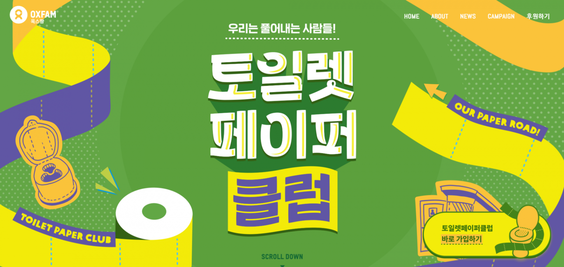 이름을 정할 때 고민이 정말 많았습니다. 누구나 쉽고 재미있게 동참할 수 있는 이름을 찾던 중 우연히 뒤집어본 옥스팜 로고의 O와 X가 마치 휴지걸이에 걸린 휴지처럼 보이는 거예요. 역시 옥스팜 안에 화장실이 있다며 그렇게 ‘토일렛 페이퍼 클럽’이라는 이름이 탄생했죠. 물론 옥스팜 로고가 화장실을 의미하지는 않습니다. 시험을 앞둔 친구에게 술술 잘 풀라고 휴지를 선물하기도 하잖아요. 이름에는 전 세계 화장실 문제가 술술 풀리기를 바라는 마음도 담겨 있어요. 실제로 많은 분들이 “재밌다”, “신선하다”고 반응해 주셨고 화장실 문제에 관심 갖는 사람도 점점 늘고 있어서 이름의 효과를 톡톡히 느끼고 있습니다.