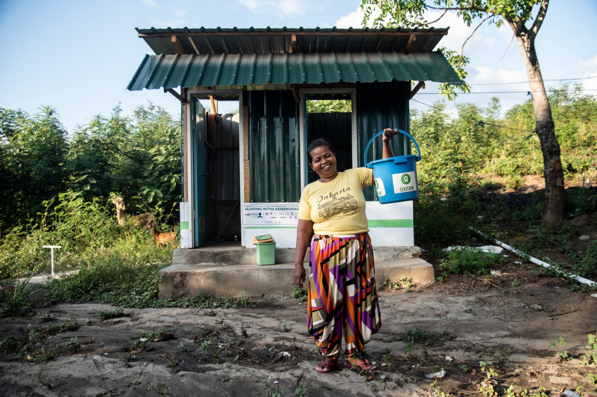 옥스팜이 설치한 화장실 앞에서 환하게 웃고 있는 인도네시아 지역 주민 © Rosa Panggabean/OxfamAUS