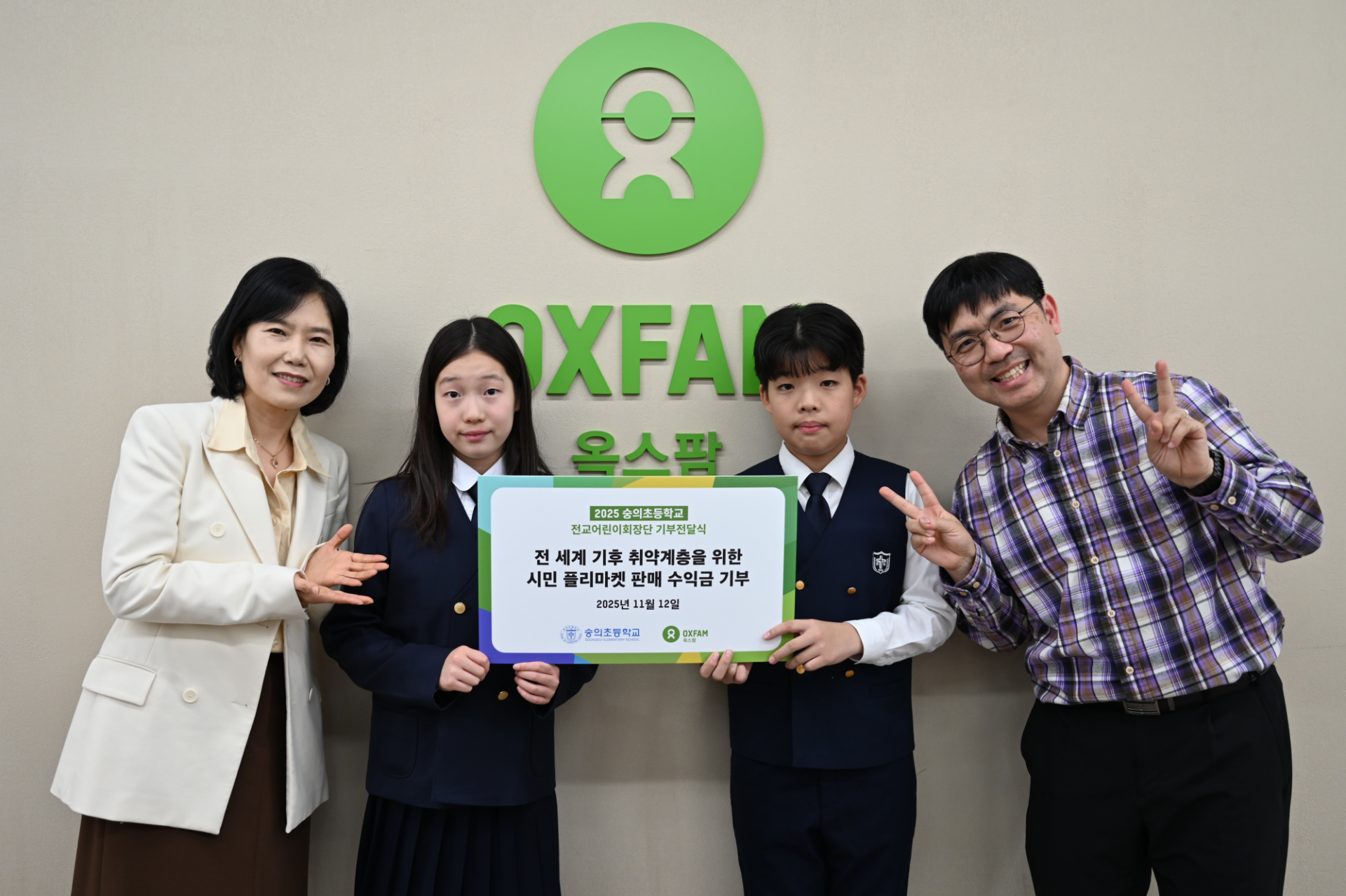 지난 11월, 숭의초등학교 전교 어린이 회장단을 대표해 이재희·고지환 어린이와 두 어머님, 그리고 박성우 선생님이 기부금을 전달하기 위해 옥스팜을 방문했습니다. 두 어린이는 누군가에게 도움이 될 수 있어서 뿌듯하다고 전했는데요. 지환 군은 땀이 뻘뻘 나는 한 여름에도 에어컨을 사용하지 않으며, 재희 양은 안 쓰는 물건을 기증하는 등 평소에도 생활 속 나눔을 실천하고 있었습니다.