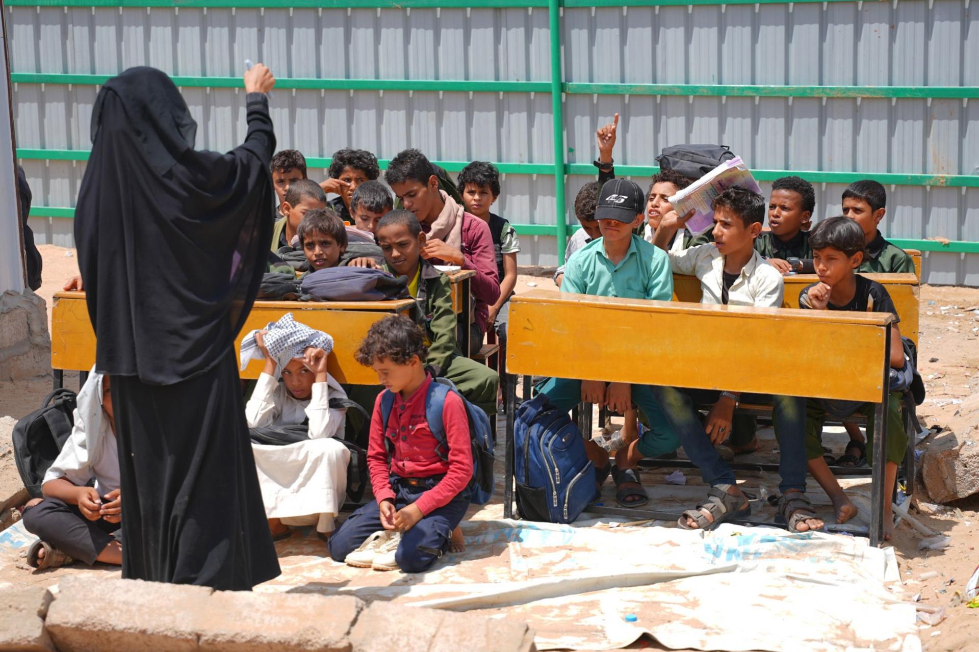 임시 야외 교실에서 수업을 듣고 있는 학생들 ⓒ Sayaf Al-Nahary/Oxfam